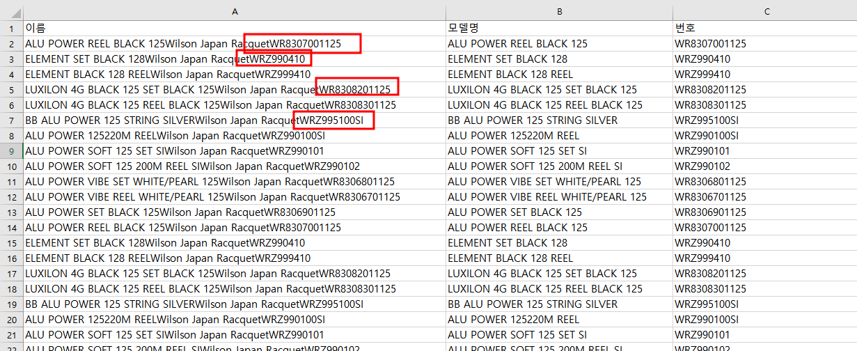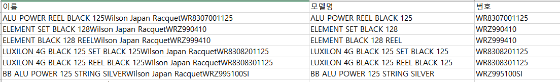 -> Wilson Japan Racquet을 찾아서 그 앞에 데이터를 가져와라