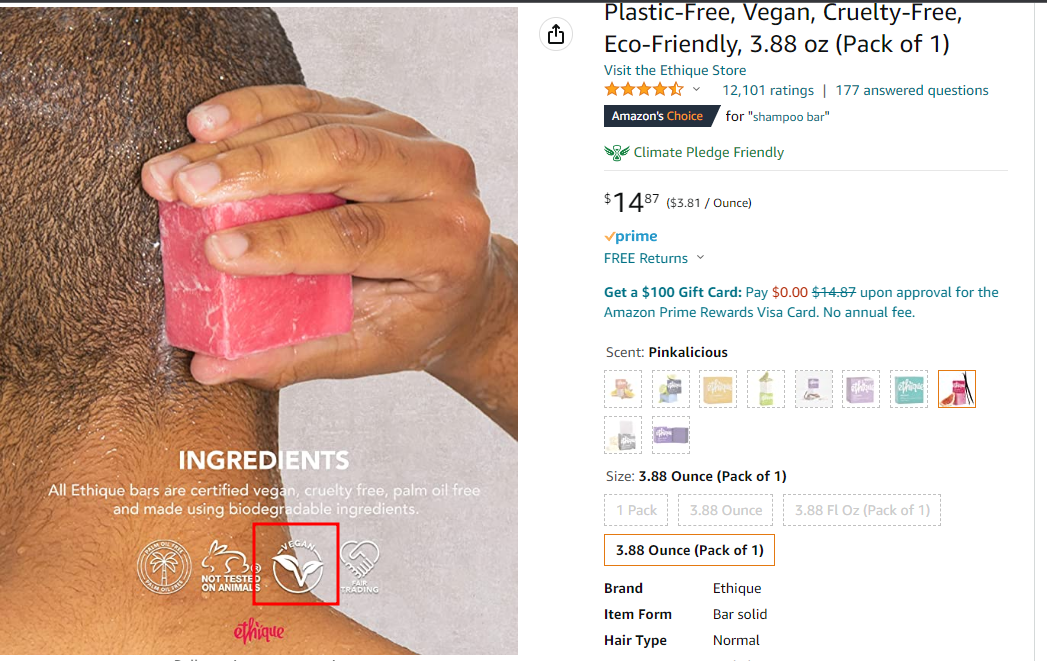 아마존 상위에 랭크된 제품 중 비건 제품을 보면 이렇게 비건 마크가 찍힘