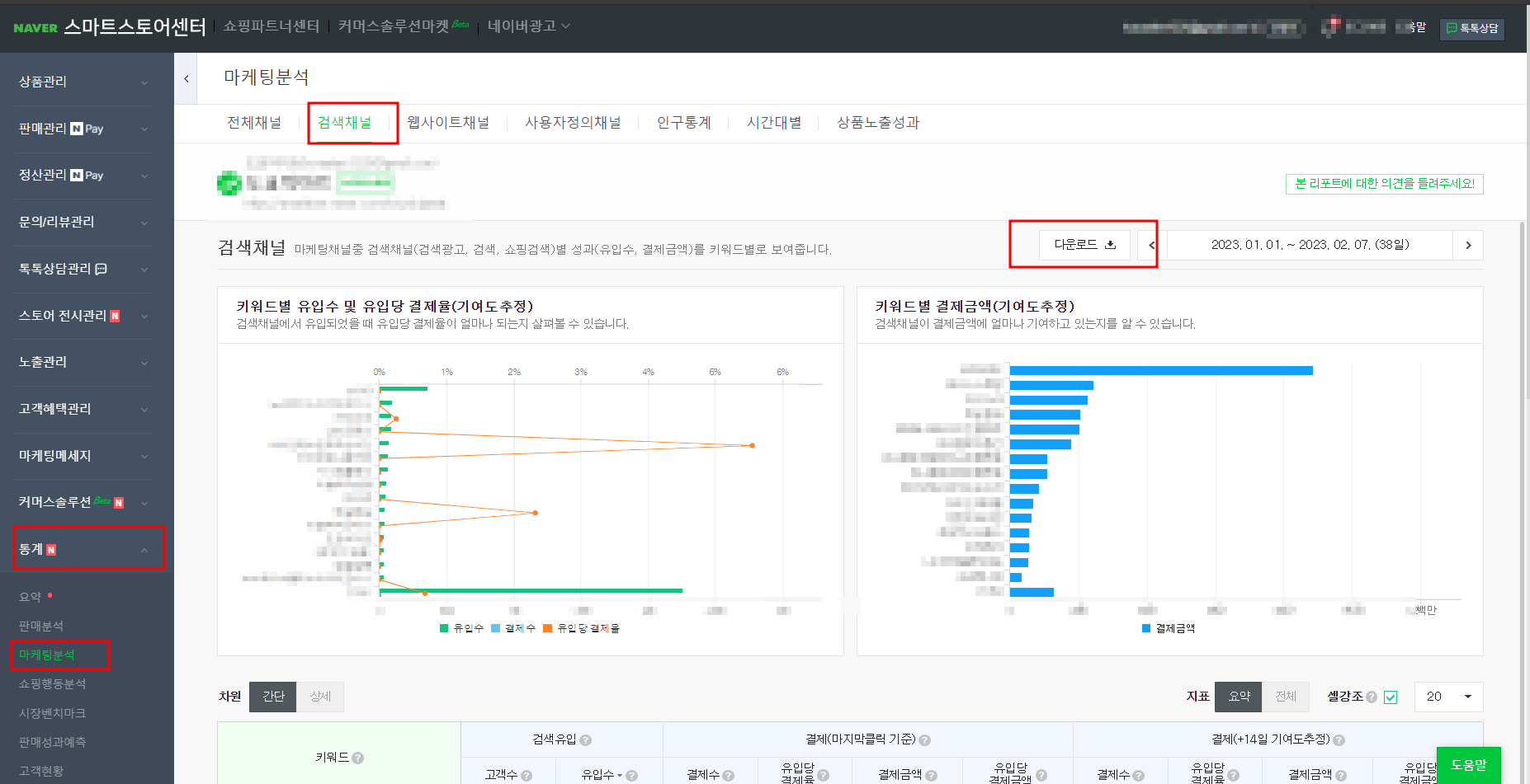 스마트스토어센터에서는 나의 스마트스토어에 기간별 키워드의 유입량 및 구매 전환율을 볼 수 있다.